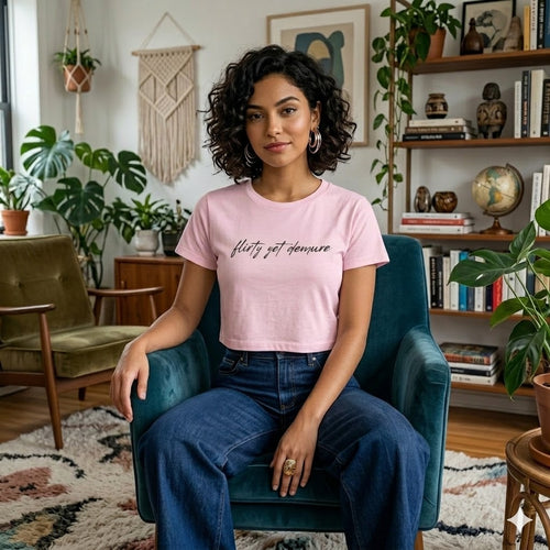 Light, cropped, and quietly confident — this baby tee slips into your wardrobe like a whispered attitude. The fitted silhouette and crew neckline give a clean, vintage-inspired shape that pairs effortlessly with high-waist jeans, layered under an oversized blazer, or stacked with summer skirts. Soft, breathable fabric moves with you and keeps things comfortable whether you’re out grabbing coffee, wandering markets, or getting ready for a low-key night out. The subtle centered script adds a personal, slightly mischievous touch without shouting for attention — it’s clothing that speaks in a knowing tone.